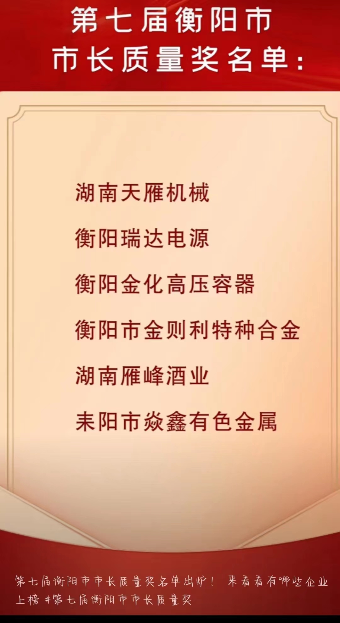 公司榮獲衡陽(yáng)市第七屆市長(zhǎng)質(zhì)量獎(jiǎng)